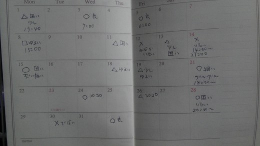 - 第二週目は水曜日頃から良くない△マークが出て、忙しい金曜日には腹痛だけで排便はなかったようです。日曜日の午後からは月曜日のことを考えて腹痛が起きているのでしょうか。